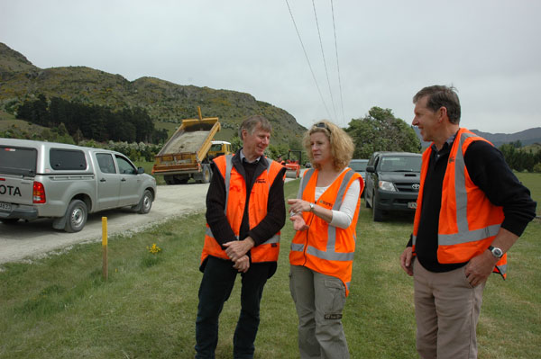 Picture: Councillor Lex Perkins, Downer EDI Divisional Manager QLDC Maintenance Kirsty Marlow and Councillor John Wilson on site at Morven Ferry Road.